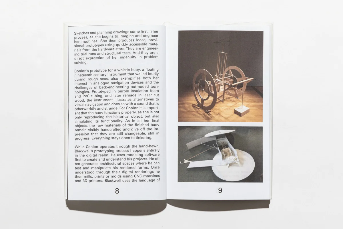 The exhibition takes place in a long room defined on one side by a series of eleven closely spaced electrical outlets. Taking advantage of this functional architecture, Conlon crafted eleven mechanical sculptures, each of which illustrates one of the eleven dimensions described by M-theory, a branch of string theory. Moving from object to object, one can see the ways that dimensional transitions flow from one to the next or leap disjunctively. Each exists on the edges of representation, where the ability to visually describe the properties of a dimension becomes a challenge of reaching and grasping ...