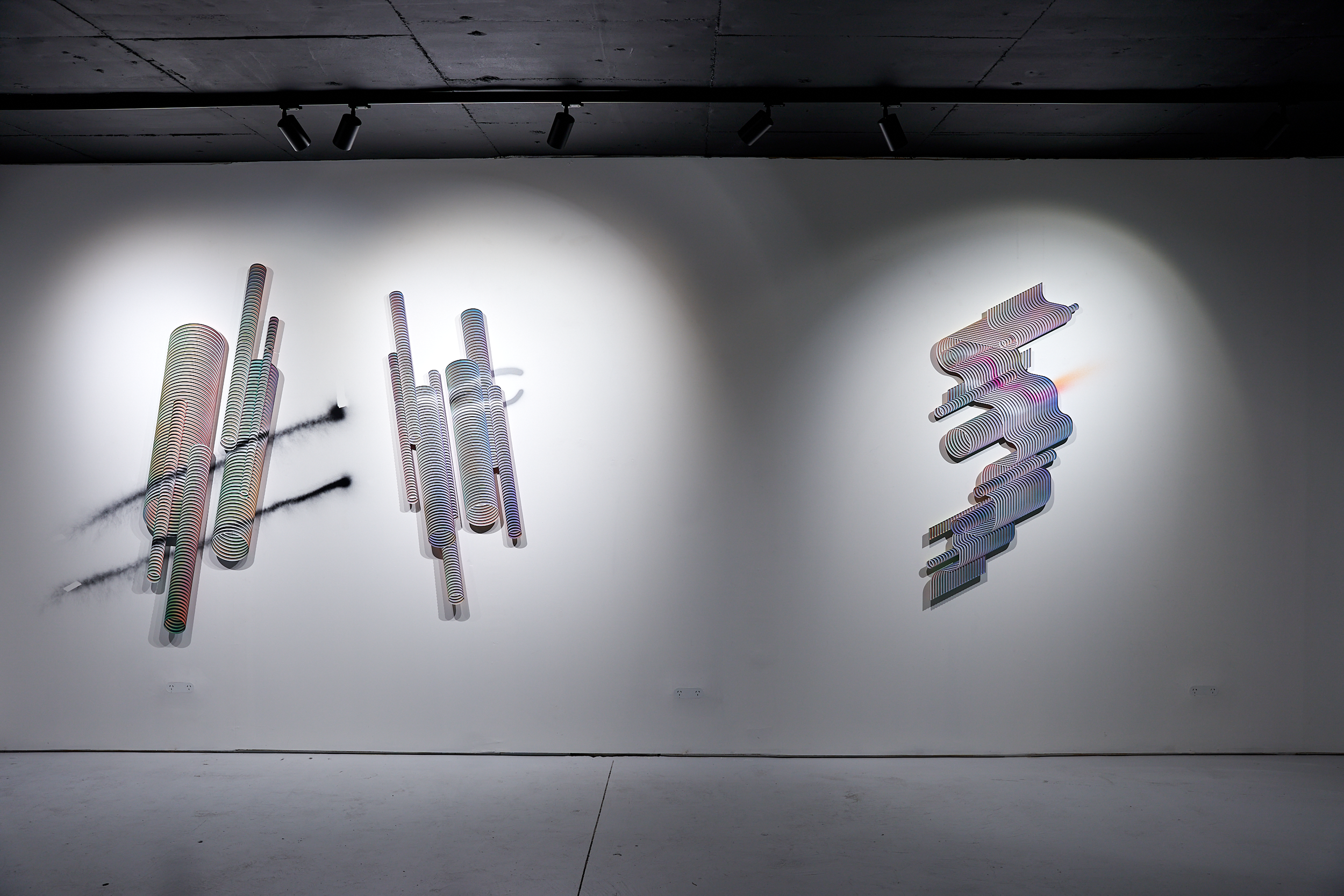 Guided by the design theories of optical art these exquisite abstract artworks have colour contrasts hand spray painted into the grooves of his carved line work. This paint application playfully references community practices like graffiti and sign writing, whilst also creating shifting colour ways as the viewer moves past them.
